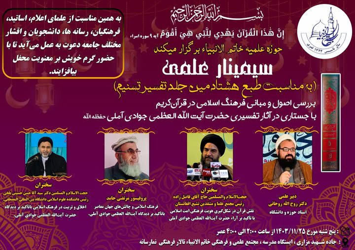 به گزارش افق اندیشه سمینار علمی «بررسی اصول و مبانی فرهنگ اسلامی در قرآن» با جستاری در آثار تفسیری آیت الله جوادی آملی (حفظه الله تعالی) و به مناسبت پایان هشتادمین جلد تفسیر تسنیم، در شهر کابل برگزارشد.